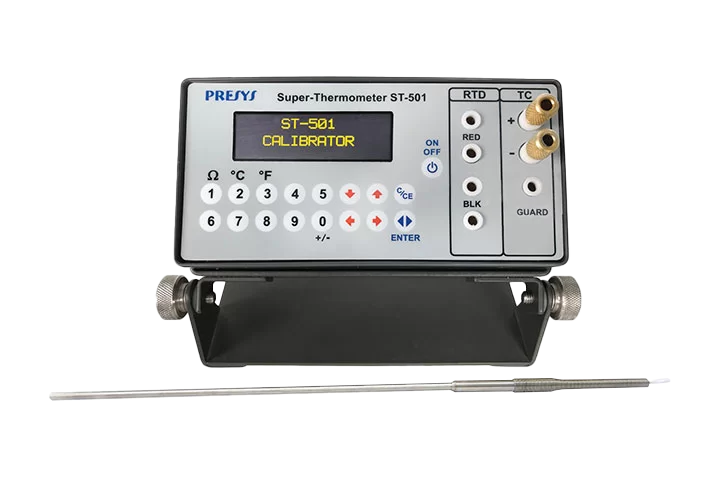 The super thermometer ST-501 main purpose is to measure temperature with high accuracy. It uses platinum resistance thermometers sensors and it also accepts standard thermocouples. The digital electronic indicator can be offered complete including the temperature sensor and calibration certificate of the pair. The ST-501 has internal algorithms to calculate the temperature value according to Callendar-Van Dusen (CVD) and ITS-90 among other international temperature tables. For customers that already have one or several RTD’s or PRT’s sensors with quality enough for being used as standards, it is only necessary to enter its respective coefficients. And for those uncalibrated probes, it is possible to use the standard linearization curves for RTDs and thermocouples.